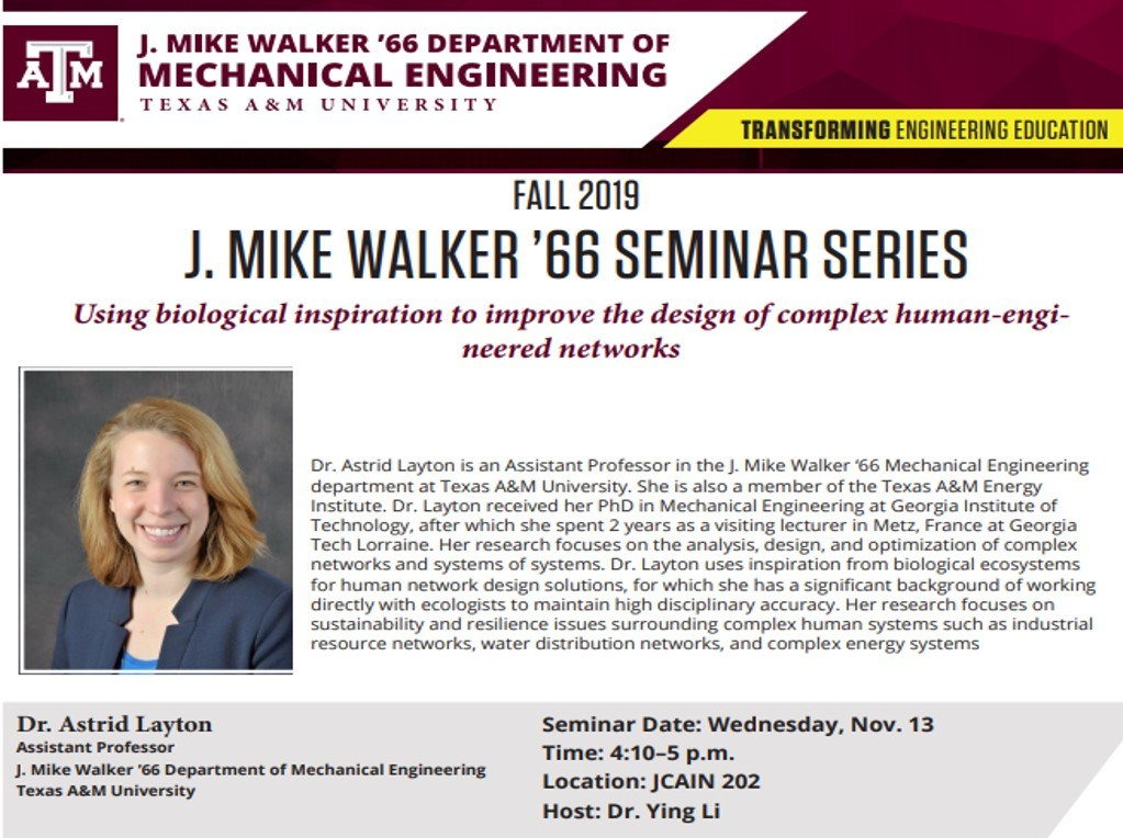 Brief description: Biological ecosystems have been through millions of years of R&D, producing complex networks of interacting species that are able to support individual needs while maintaining system-level functions. In this talk, Dr. Layton will show that these networks offer a relatively untapped source of design inspiration for improving the sustainability and resilience of our human-engineered networks. Quantitative descriptors and analysis techniques are adapted from ecology through close collaboration with ecologists, enabling desirable ecosystem characteristics to be used as optimization guides for industrial resource networks (or eco-industrial parks, EIPs), water networks, supply chains, and power grids. Characteristics such as a high level of cycling of materials/energy within the system and a unique balance between redundant and efficient pathways are connected back to the achievement of traditional engineering goals such as cost and robustness.