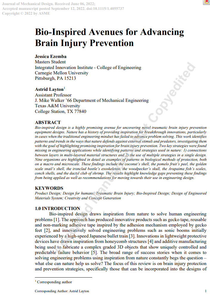 (2022) *Ezemba, J.; Layton, A. “Bio-Inspired Avenues for Advancing Brain Injury Prevention.” Journal of Mechanical Design. DOI: 10.1115/1.4055737