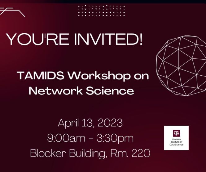 Thursday, 9am-3:30pm CDT Texas A&M Institute of Data Science (TAMIDS) is hosting a “Network Science Workshop” organized by Dr. Nate Veldt , assistant professor in the Department of Computer Science and Engineering at Texas A&M University. The workshop is in person at Blocker 220. To register for the event, please click here.