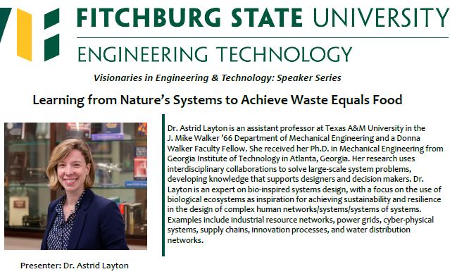 Dr. Layton Invited Research Seminar for Fitchburg State April 27, 2023May 22, 2023alayton6 Leave a comment BiSSL director Dr. Astrid Layton will be presenting BiSSL work as part of the Fitchburg State Visionaries in Engineering & Technology speaker series. Her talk is titled “Learning from Nature’s Systems to Achieve Waste Equals Food.” Share this: Click to share on X (Opens in new window) X Click to share on Facebook (Opens in new window) Facebook Like Loading... Related