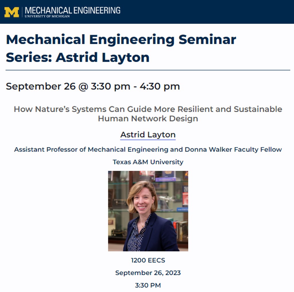 Dr. Layton gave an invited seminar presentation at University of Michigan titled “How Nature’s Systems Can Guide More Resilient and Sustainable Human Network Design” Sept. 26, 2023. The talk coincided with some excellent collaborative brainstorming with Dr. Sita Syal and other new contacts.