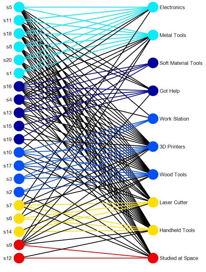 This paper used a sub analysis technique of modularity, using a p-z analysis to identify tool roles in a makerspace. The results were compared across class years (sophomore-senior) and whether or not the makerspace was used for class-based use. The results found that 3D printers remained key “hub” tools across all 3 years, metal and handheld tools were added as hub tools in junior year, and wood tools and the CAD station were added senior year. The paper shows value in using survey information alongside the quantitative network metrics.